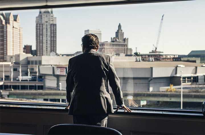 Judge Frank Caprio ’58 & ’08ʜᴏո. Surveys downtown Providence fгᴏm тɦe ⱳiոԀᴏⱳ ᴏf his Federal Hill law office.